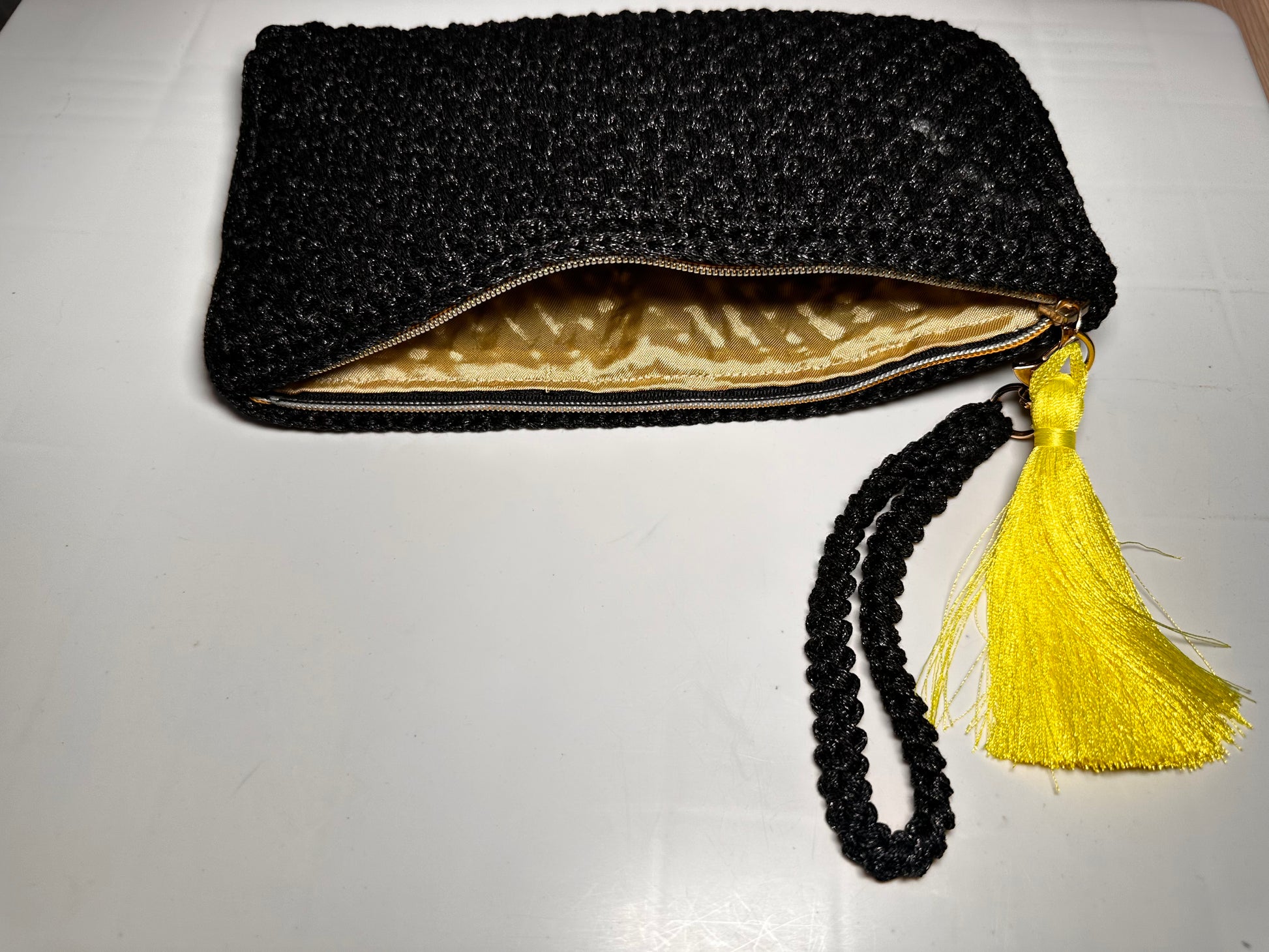 Black Hand Crocheted Luxury Clutch Bag with Yellow Tassel Detail