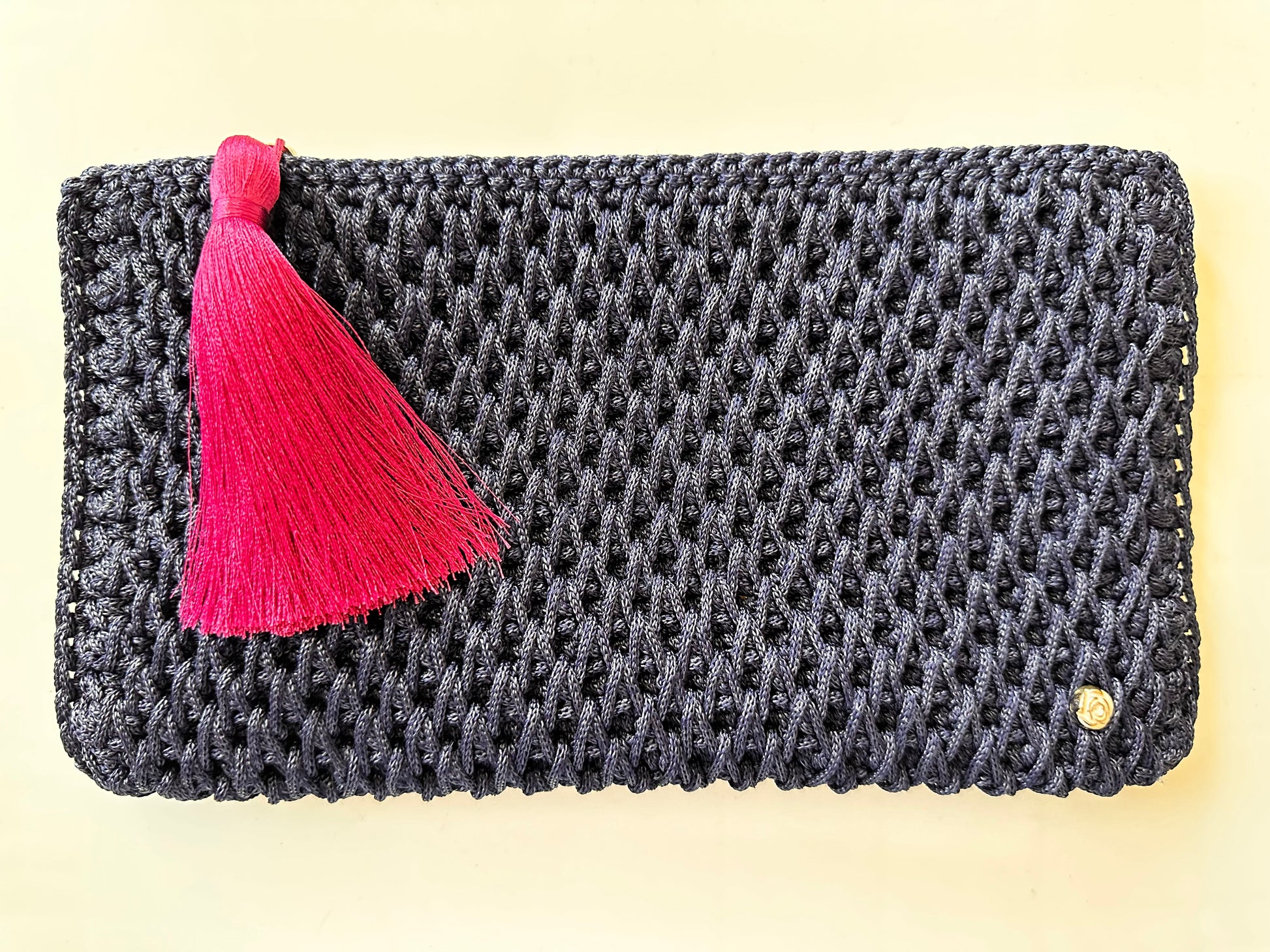 Navy Hand-Crocheted Luxury Clutch Bag with Pink Tassel Detail
